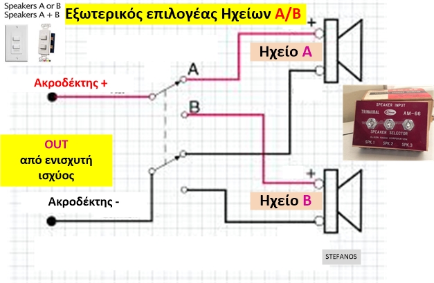 Ο σκοπός των ακροδεκτών ‘’ Α’’ και ‘’Β ‘’(που ελέγχονται από ενσωματωμένο στον ενισχυτή ή εξωτερικό διακόπτη Α , Β , Α+ Β ) είναι να επιτρέψουν τη σύνδεση δύο ζευγών (Right/Left) ηχείων σε δύο διαφορετικές τοποθεσίες ... π.χ. το ένα ζεύγος στο δωμάτιο σας και το άλλο στο σαλόνι ή στην αυλή…..