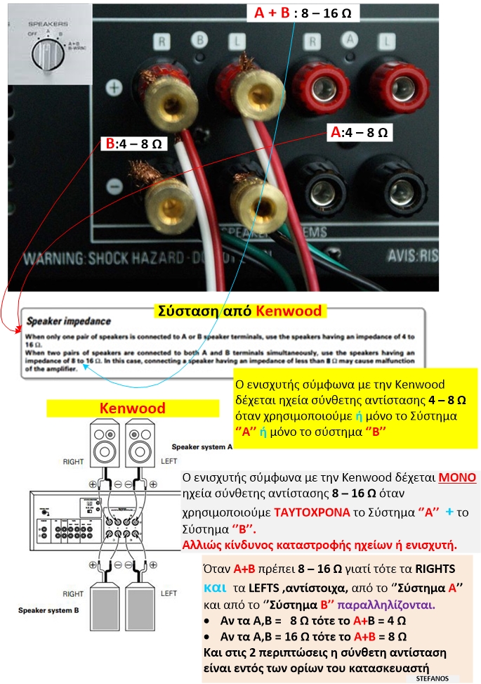 Θα είστε ασφαλείς , αν και τα 2 ζευγάρια (στο Σύστημα ‘’Α’’ και ‘’Β’’) είναι 8 Ω ή 16 Ω όπως αναλύεται και δείχνεται στη φωτογραφία.