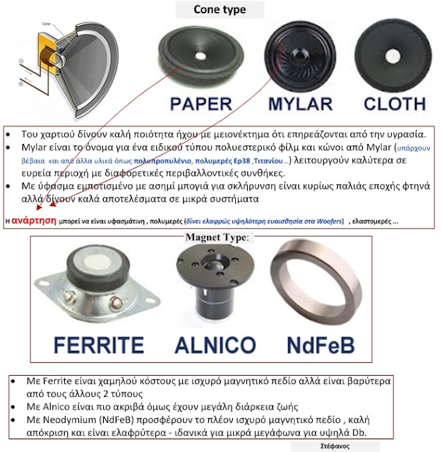 Κάθε ένας απ’ τους παραπάνω τύπους έχει και την δική του ηχητική ταυτότητα, βέβαια σε συνδυασμό με το αντίστοιχο cabinet και το crossover που εξετάζουμε αναλυτικά παρακάτω:3. παράμετροι Thiele-Small