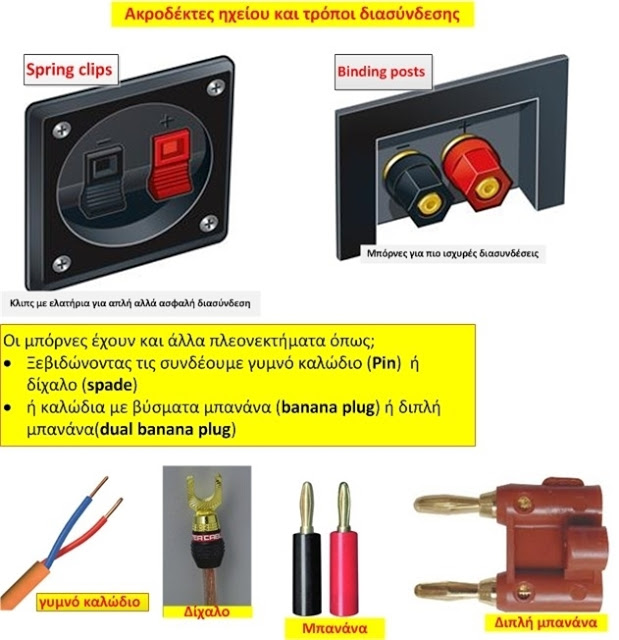 Η σύνδεση ηχείου στον ενισχυτή είναι απλή διαδικασία αφού απαιτούνται μόνο 2 σύρματα το θετικό (+ ή συνήθως κόκκινο χρώμα) και το αρνητικό (- ή μαύρο χρώμα).