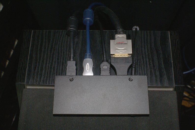 Όπως βλέπετε στη δεύτερη photo, οι τρεις πηγές μου συνδέθηκαν στο switcher με τον εξής τρόπο: Από το Toshiba E1 ένα δίμετρο καλώδιο HDMI σε HDMI με επίχρυσες επαφές στη πρώτη είσοδο. Από το HTPC ένα δίμετρο καλώδιο DVI σε HDMI με επίχρυσες επαφές στη δεύτερη είσοδο. Από τον Humax 2000 ένα δίμετρο καλώδιο HDMI σε HDMI (αυτό που υπήρχε στη συσκευασία, με απλές επαφές) στη τρίτη είσοδο. Από την έξοδο του switcher, ένας αντάπτορας HDMI σε DVI με επίχρυσες επαφές και από κει τέλος το δεκάμετρο καλώδιο Oehlbach DVI σε DVI στον BenQ! Όπως καταλαβαίνετε, οι μετατροπές του σήματος είναι πάμπολλες, πραγματικά είχα ενδοιασμούς αν ο switcher θα κλείδωνε τελικά! Επίσης όπως μπορείτε να δείτε στη photo, ο αντάπτορας HDMI σε DVI αναγκάζει το βύσμα τροφοδοσίας να μπαίνει στραβά στη παροχή ρεύματος που είναι ακριβώς δίπλα, ευτυχώς χωρίς συνέπειες.