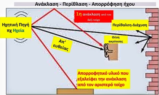 • Εάν όμως οι επιφάνειες καλύπτονται με υλικό ηχοαπορρόφησης , ο ανακλώμενος ήχος θα μειωθεί πολύ πιο γρήγορα και ο ακροατής θα ακούει ‘’μόνο’’ τον άμεσο ήχο. Φυσικά τότε και η γενική στάθμη ήχου στο δωμάτιο θα μειωθεί .