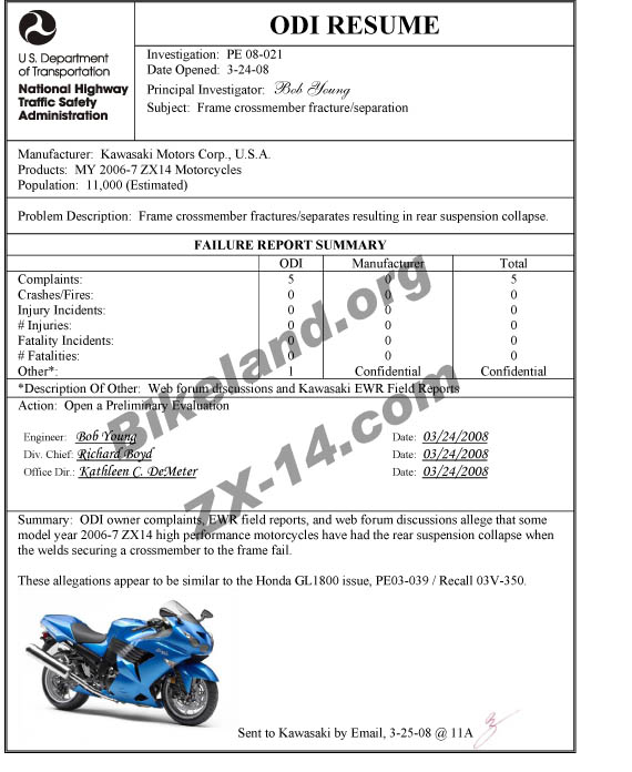 Τα μοντέλα με αριθμό πλαισίου από JKBZXT40AAA000004 έως JKBZXT40AAA026070 (ZZR1400) και από JKBZXT40ABA000069 έως JKBZXT40ABA026279 (ZZR1400 ABS), παραγωγής 2006 και 2007, ανακαλούνται γιατί παρουσιάζουν πρόβλημα στη στήριξη του κινητήρα.