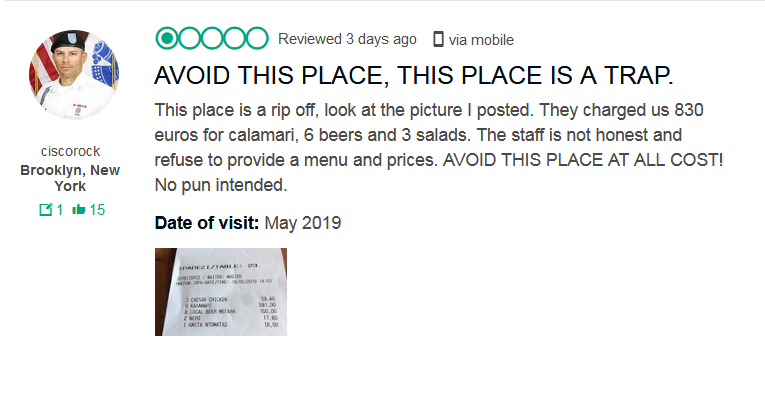 Κι αν θέλετε να μάθετε κι άλλα, αυτή είναι η πρώτη κριτική του χρήστη στο TripAdvisor. Από εμπειρία ορμώμενος το λέω, οι άνθρωποι που μπορούν να σκάσουν τόσα λεφτά (850 για 3 άτομα) είναι πιο ένεργοί στο TriAdvisor και στην προηγούμενη ζωή τους. Δεν θα περίμεναν να ξεκινήσουν να γράφουν από την Μύκονο κι έπειτα, θα έγραφαν κι απ' το χωριό τους, από όταν δεν ήταν τόσο άνετοι κι έσκαγαν 50ρικα...