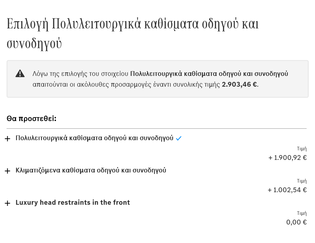 Όχι διπλά, τριπλά έτσι όπως το βλέπω!! Μόνο το ηχοσύστημα έχει 6.000 εξτρά!!!! Βάλε και άλλα 6 για τα καθίσματα, 4 για τον εσωτερικό φωτισμό, 2 για Head up display, έφτασες το Tesla!!!! :errwhat: Το έχει ξεφτιλίσει η Mercedes, αδειο το παίρνεις με τιμή καταλόγου και προσθέτεις μηδενικά