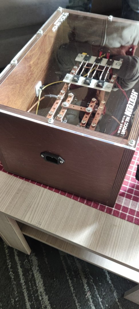 Kορυφαια υλικα(επώνυμοι πυκνωτές με πολύ χαμηλό ESR και μεγάλη χωρητικότητα, πολύ υψηλό ripple current, καλώδια Νeotech 7N UPOCC και ultra fast diodes με αντοχή σε πολύ μεγάλα φορτία, μπάρες χαλκού, power resistor της arcol, IEC gold furutech), μπηκαν σε ένα πολύ καλό και στιβαρό ξύλινο κουτί με μεγάλη προσοχή στην στήριξη των επιμέρους components με το plexiglass καπακι και βγήκε αυτό που βλέπετε...