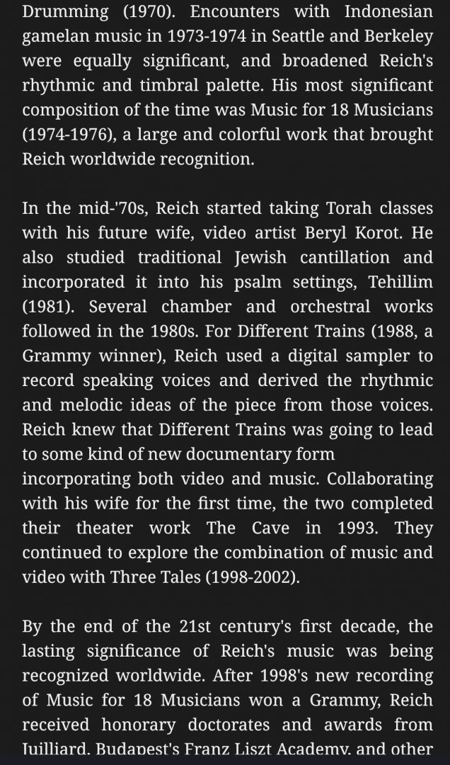 Αν εσύ ξέρεις 5 πράγματα για την κλασική μουσική, ο Ράιχ ξέρει 855 εκατομμύρια πράγματα για τη μουσική, απλώς έχεις κάποια απόσταση να καλύψεις....