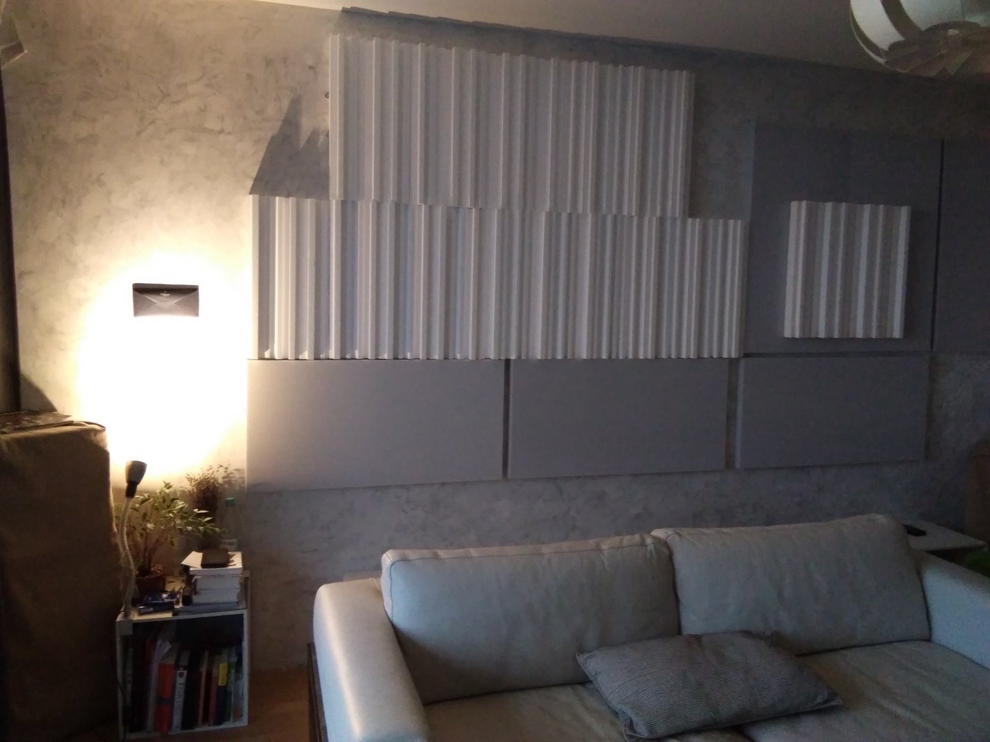 Επίσης χρησιμοποιήθηκαν πάνελ διάχυσης της t. Akustik τα οποία και τοποθετηθηκαν κατά κύριο λόγο πίσω, στην θέση του πινακα, εδώ παίζουμε μπάλα εμείς, κουλτούρα και πίνακες δεν έχει, άμα θέλω να ζωγραφίσω, τραβάω καμία καμπύληελπίζω αυτήν την φορά να μην βγει κάνας πιγκουίνος να αμφισβητήσει και τις φωτογραφίες που επισυνάπτω στο τέλος.