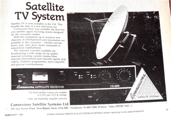 Το 1983 διάβασα για πρώτη φορά σε γαλλικό περιοδικό άρθρο που αναφερόταν στους μελλοντικούς γεωστατικούς δορυφόρους, που θα μπορούσαν να μεταδίδουν τηλεοπτικό σήμα πολύ έξω από τα γεωγραφικά σύνορα μιας χώρας και αυτό μου «άνοιξε την όρεξη» για την μελλοντική λήψη γαλλικών καναλιών. Η πρώτη φορά όμως που είδα με τα μάτια μου δορυφορικό κανάλι ήταν στα τέλη του 1987, όταν σε κάποια έκθεση ηλεκτρονικών στην πόλη μου ανάμεσα στα VHS βίντεο φιγουράριζε και μία τηλεόραση της Φιλανδικής Salora, η οποία συνδέονταν με ένα κάτοπτρο μόλις 1.2m και έκανε λήψη του ρωσικού καναλιού Horizont από τις 14 μοίρες δυτικά σε μπάντα C, διαθέτοντας ενσωματωμένο δορυφορικό δέκτη!