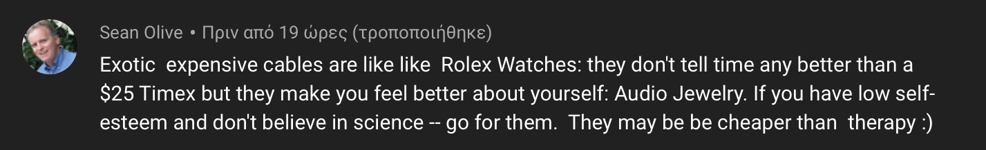 Έχουν πραγματοποιηθεί άπειρες μετρήσεις, σε πολλά sites και εύκολα προσβάσιμες, ακόμα και σε καλώδια εθερνετ, ακόμα και σε συσκευές για δίκτυο, και άλλα πράγματα οφθαλμοφανώς άχρηστα, μετρήσεις πραγματικά πολύ υψηλής ακρίβειας και άριστης επαναληψιμότητας, που πιάνουν διαφορές απειροελάχιστες και μη ακουστές, που αποδεικνύουν πέραν πάσης αμφισβήτησης ότι δεν υπάρχουν πρακτικά μετρήσιμες διαφορές.