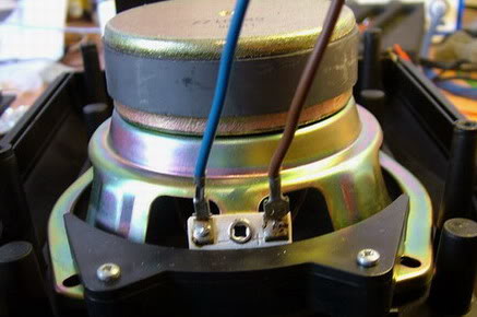 Εσωτερική καλωδίωση και λεπτομέρεια από τη στήριξη του καλωδίου επάνω στο μεγάφωνο.