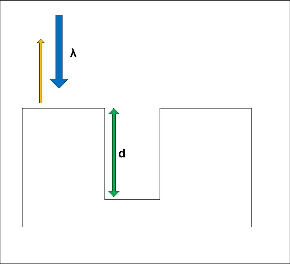 Με μπλε χρωμα παρουσιαζεται το προσπιπτωμενο κυμα μηκους λ. Ο τροπος με τον οποιο θα γινει η ανακλαση εξαρταται φυσικα απο το βαθος της εσοχης σε σχεση με το μηκος κυματος λ.