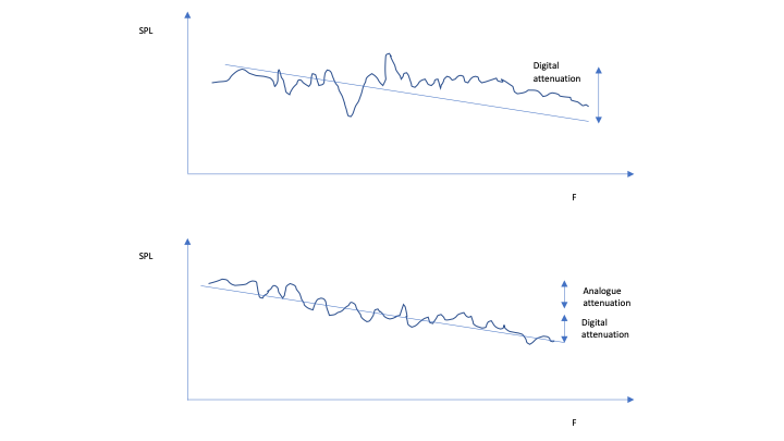 Σε αυτη την περίπτωση (που καταλαβαίνω είναι η περίπτωση του κοσμοναύτη) γλιτώνεις λίγο ψηφιακό attenuation, όπως φαίνεται στο παρακάτω σχήμα. Και γλιτώνεις ψηφιακό attenuation στα πρίμα, εκεί που ίσως ακούγεται, λέμε τώρα. Ή ανάποδα, κερδίζεις λίγο ψηφιακή δυναμική περιοχή.