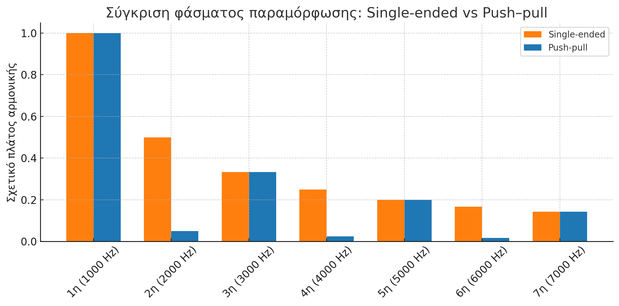 στο single-ended εμφανίζονται έντονα και οι άρτιες και οι περιττές αρμονικές, ενώ στο push-pull ακυρώνονται σε μεγάλο βαθμό οι άρτιες, μένουν κυρίως οι περιττές.