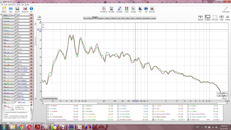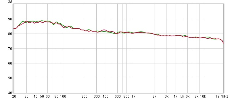 Και ως συμπληρωματική αναφορά,οι αποκρίσεις αριστερού (πράσινο) και δεξιού (κόκκινο) καναλιού σε setup χωρίς sub,στημένο σχολαστικά με το αυτί με γνώμονα τη γνωστή καμπύλη της Bruel & Kjaer και χωρίς την παραμικρή διόρθωση μέσω DSP ή φροντίδα ειδικά στις πρώτες οκτάβες,μονάχα παθητικές επεμβάσεις (απορρόφηση/διάχυση) με ωφέλιμο εύρος πάνω από τη ζώνη Schroeder.