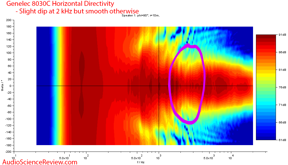 Στον μωβ κύκλο, έχουμε μια ανωμαλία, έχουμε δηλαδή μια αυξημένη κατευθυντικότητα της ενέργειας του ηχείου, σε σχέση με το παρακείμενο φάσμα, όπου έχει περισσότερη διασπορά η ενέργεια προς τις πέριξ κατευθύνσεις.