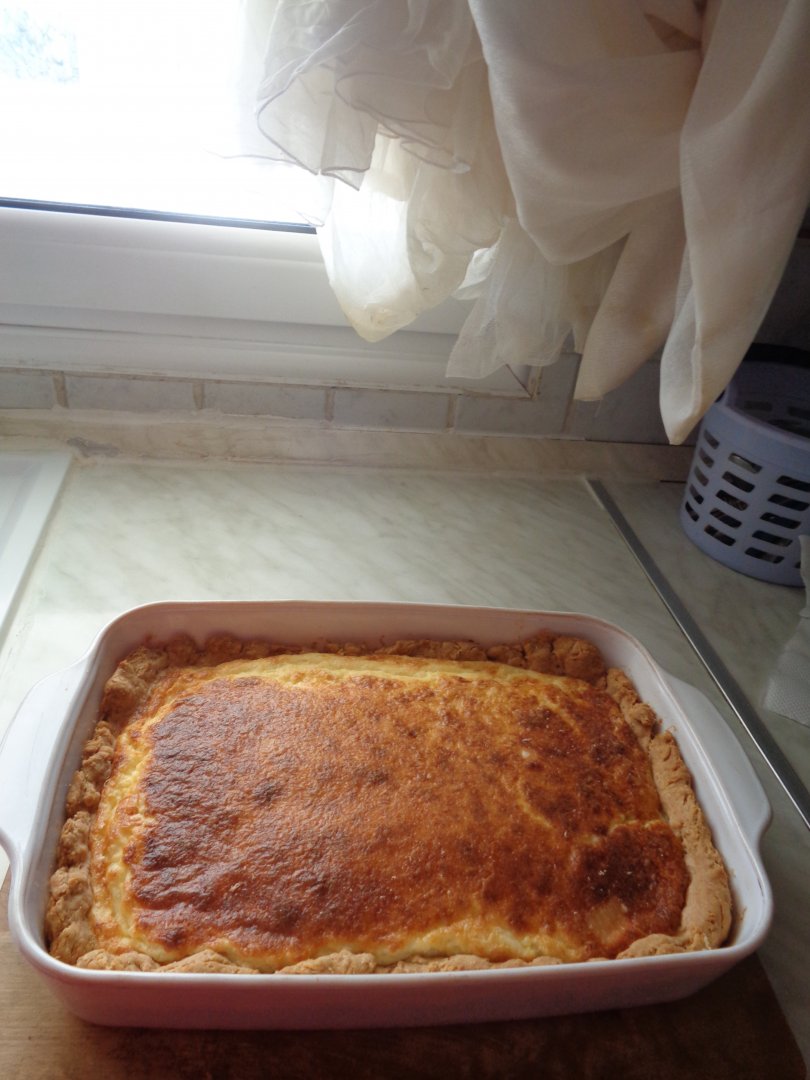 Τάρτα με τέσσερα τυριά: φέτα,κασέρι,γραβιέρα Αμφιλοχίας...Το τέταρτο είναι pecorino romano τριμμένο στην επιφάνεια για τη δημιουργία κρούστας...