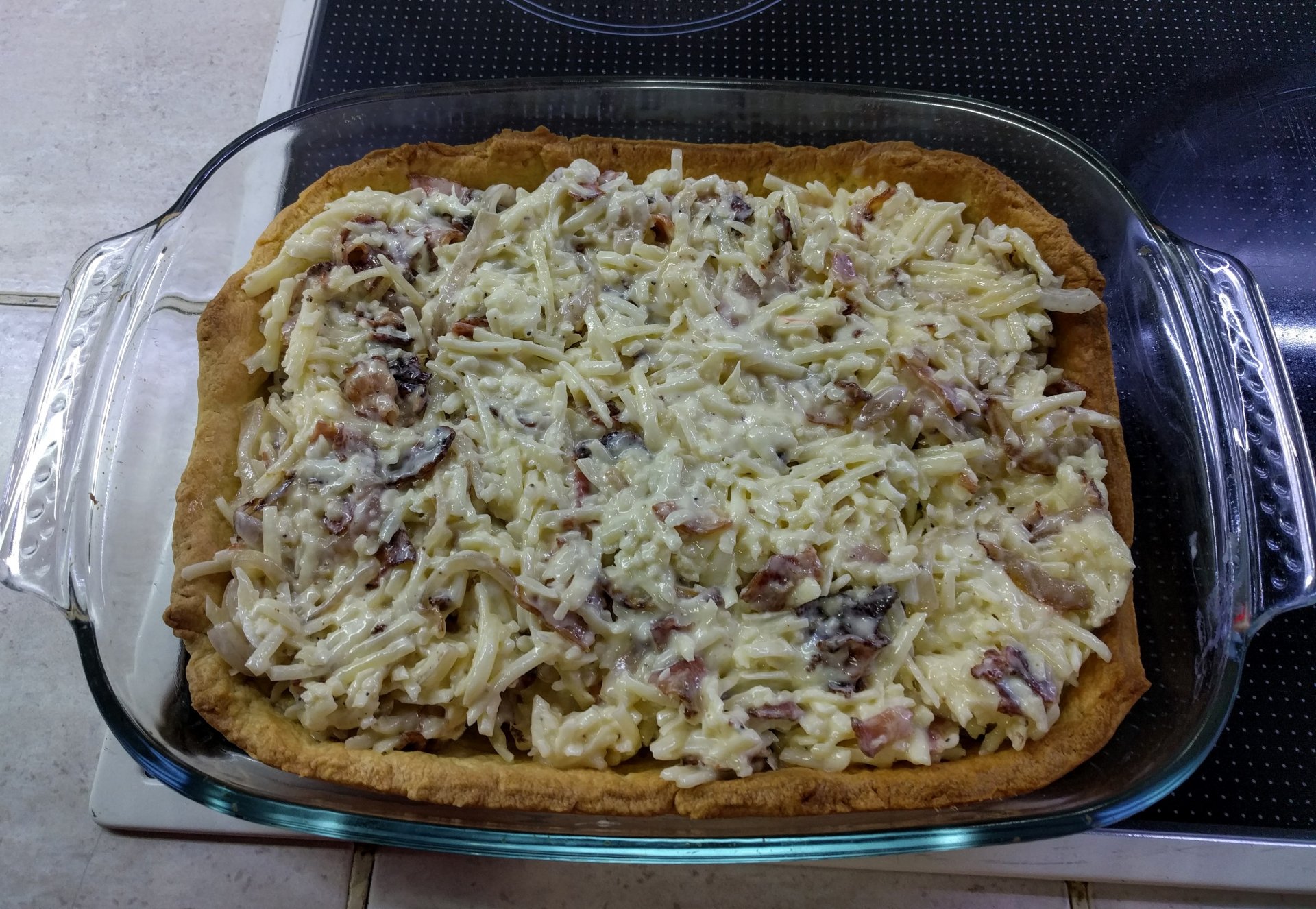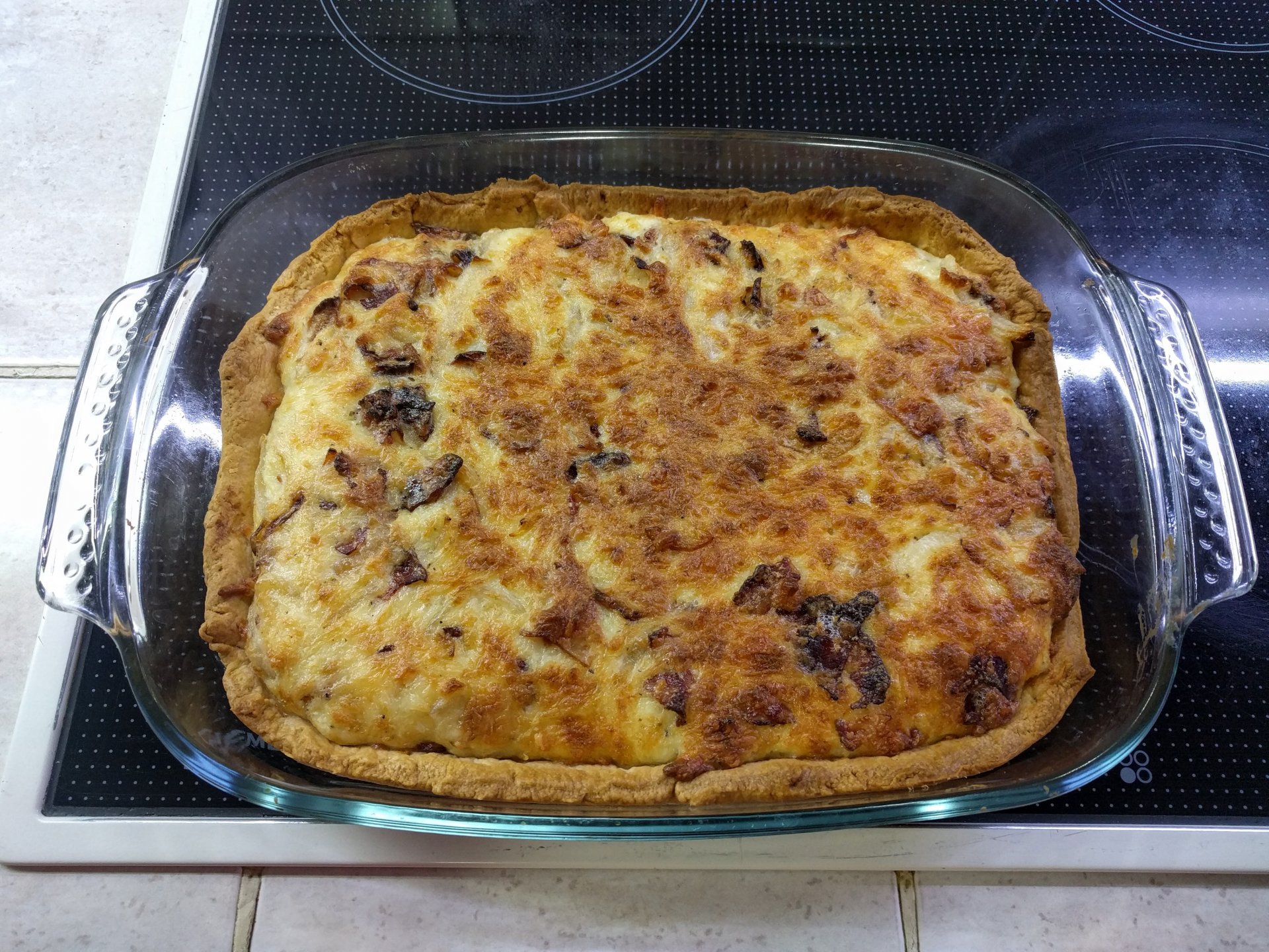 Chωτάρεις το μπέικο μέχρι να γίνει κρίσπικο σε χαμηλομεσαία ένταση, πετάς τα κρεμμύδια για πέντε λεπτά ανακατεύοντας, τρίβεις 400gr φίνα gruyere Κρήτης ή ελβετική, ψευτοχτυπάς δυό αυγά, τα ανακατεύεις όλα μαζί με λίγο αλάτι, πιπέρι και 200gr κρέμα γάλακτος, και τα απλώνεις στην έτοιμη ζύμη για τάρτα που έχεις ροδίσει στο φούρνο καλυμμένη με λαδόκολλα και λίγο ρύζι μέσα για να μη φουσκώσει. Τα χώνεις για μισή ωρίτσα στο φούρνο στους 160°.