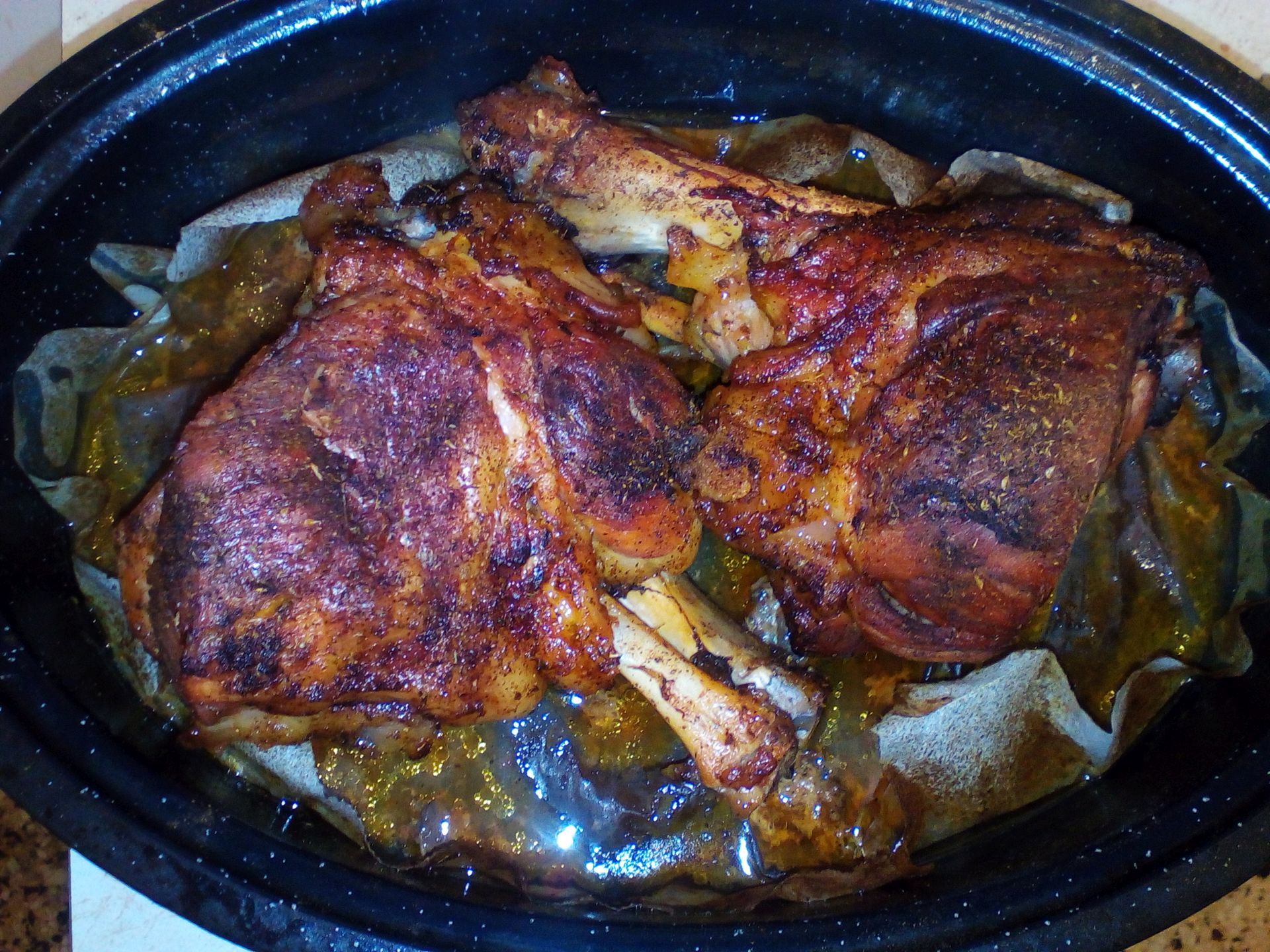 Δύο κότσια στην γάστρα με ζωμό λαχανικών κνορ, ψημένα επί 4ωρο.