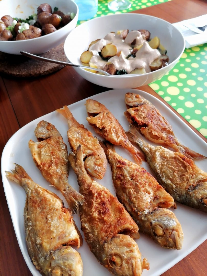 Λίγδες (κανονικές, όχι μπάμιες του κορεκτορα) τηγανιτές, πατατοσαλάτα με σέσκουλα