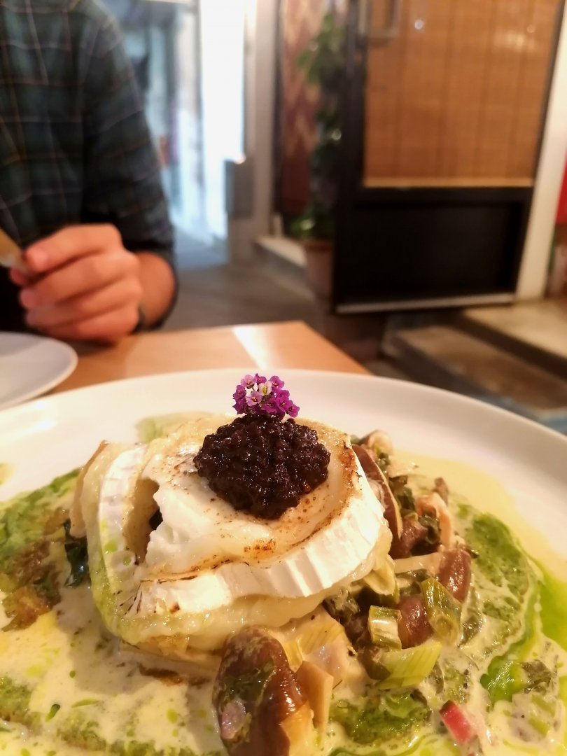 Κρέπα τσουκνίδας με σέσκουλα, μανιτάρια σιτακε και κορμό κατσικίσιο