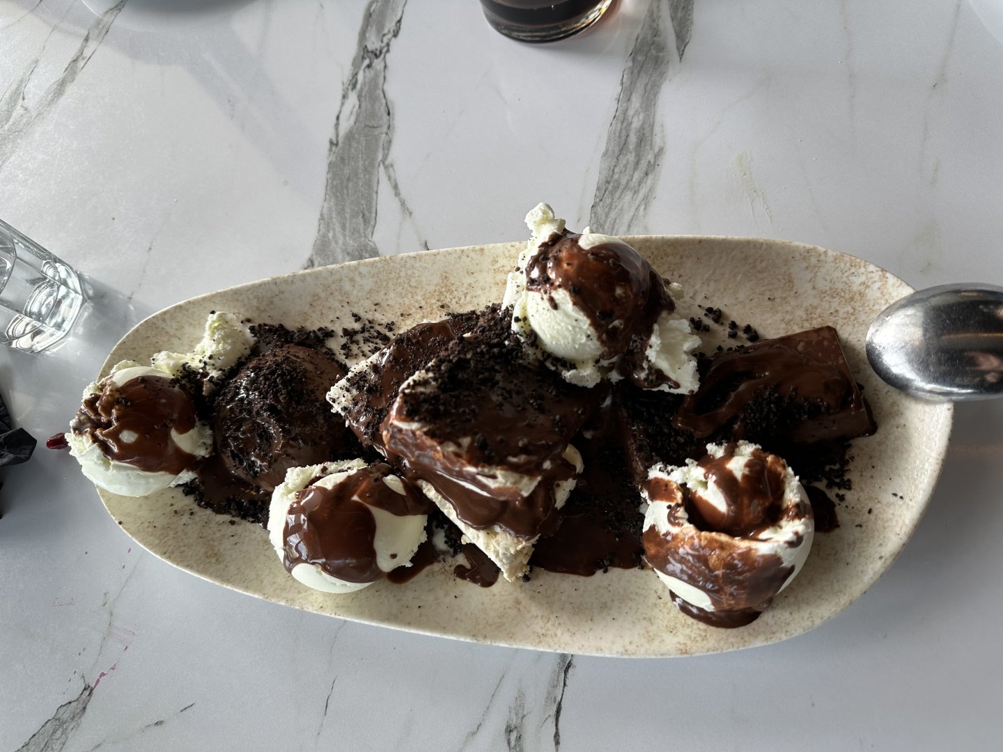 Παγωμένη Ganache σοκολάτα, παγωτό, τρίμματα cookies, λιωμένη σοκολάτα και αρμενοβίλ.