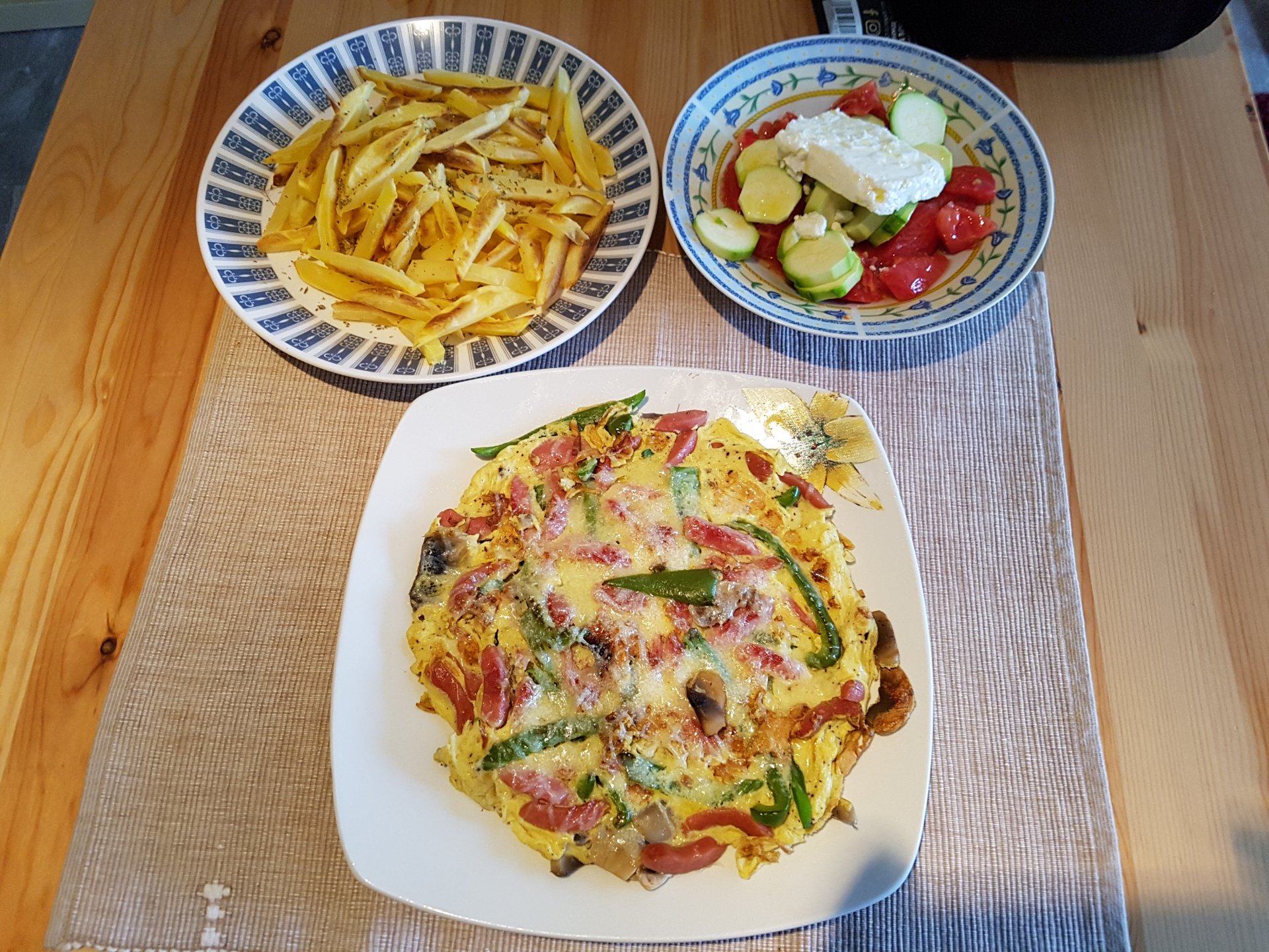 την φέτα με τσεκούρι την κόβεις πλέον έτσι?Πατάτες φούρνου, στη σαλάτα δεν είναι αγγουράκι, είναι κολοκυθάκια.