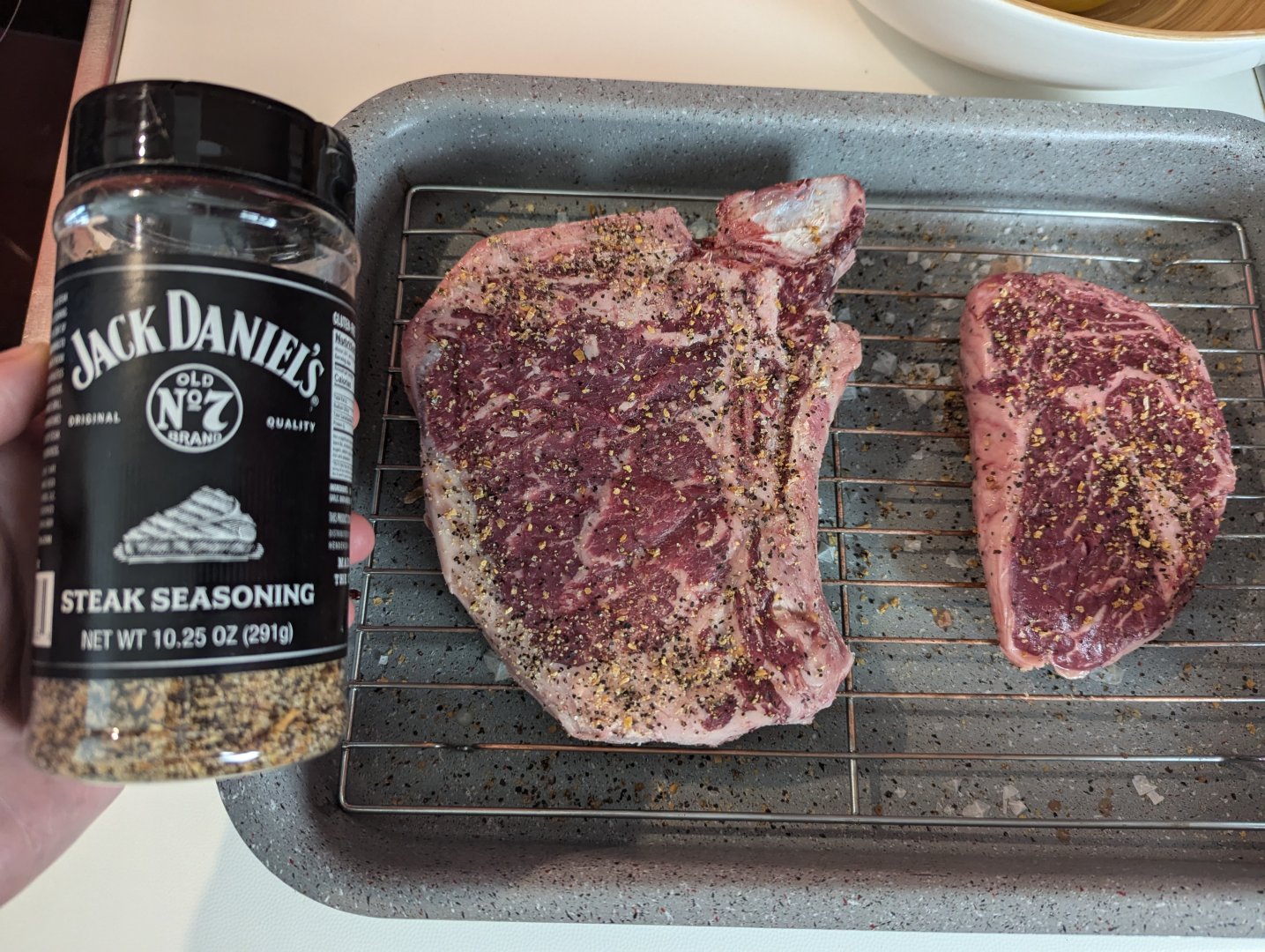 Πολύ ωραίες, αλλά δεν κάνω λάικ γιατί ξέρω ότι θα τις φας ωμές.Αγαπημένες μπριζόλες, USA prime black Angus t-bone η μεγάλη, Αργεντινής ίδιο μοσχάρι η μικρή - rib eye, στεγνώνουν πασπαλισμένες με το γνωστό μίγμα του jack Daniel's: