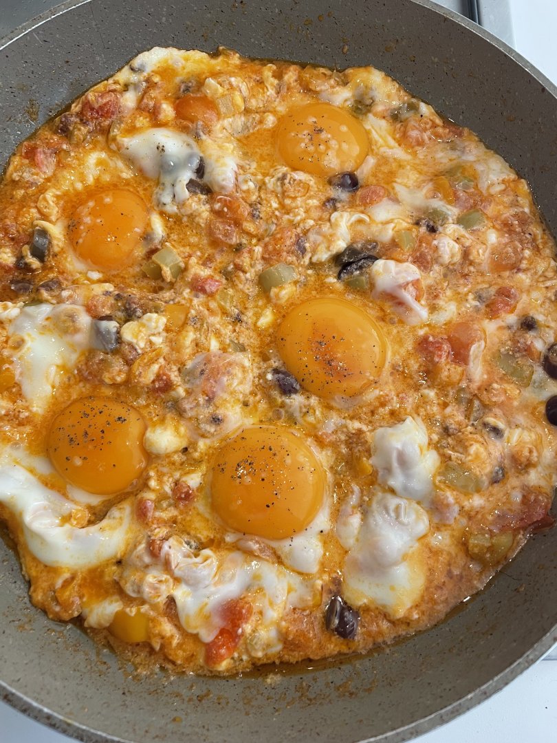 Δε λέω, καλό ακούγεται, αλλά...ομελέτα με τους κρόκους άθικτους...δεν έχω ξαναξαναματαδείΟμελέτα με πιπεριές, ντομάτα, κατσικίσιο τυρί, ελιά και σουτζούκι.