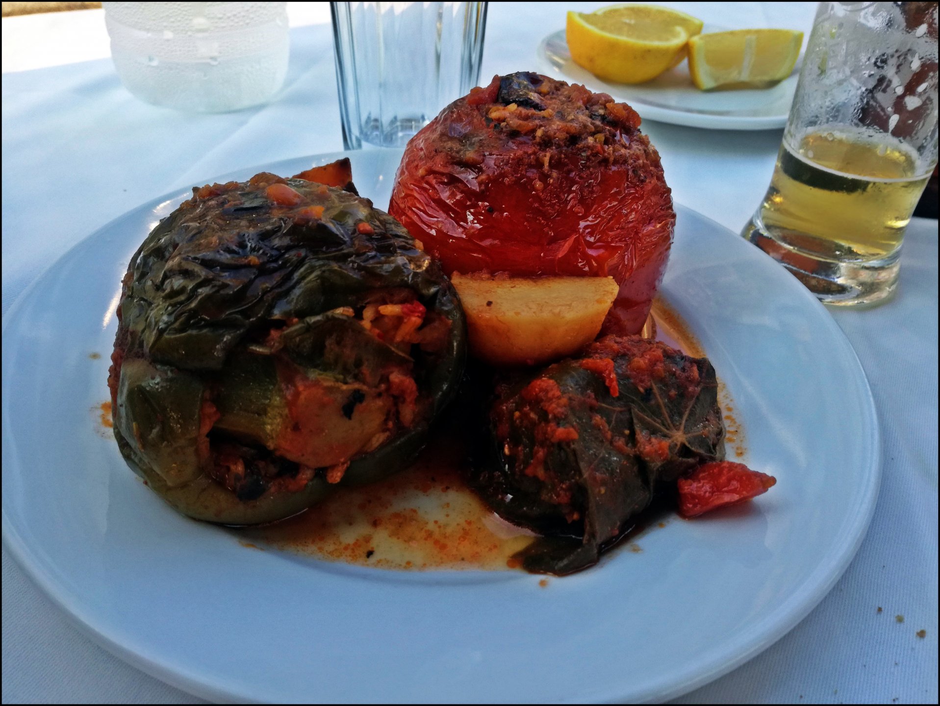Σουπιές & χταπόδι κοκκινιστό, σκορδαλιά Special, πιπεριές κέρατο ψητές στο φούρνο με σκόρδο και λαδόξυδο, πατάτες τηγανιτές, ρύζι, σπανακόπιτα (με φύλλο σφολιάτας, σπανάκι,πράσο,πατάτα ψητή, κλπ) σαλάτα χωριάτικη και κρασί αγιωργίτικο ημίγλυκο..