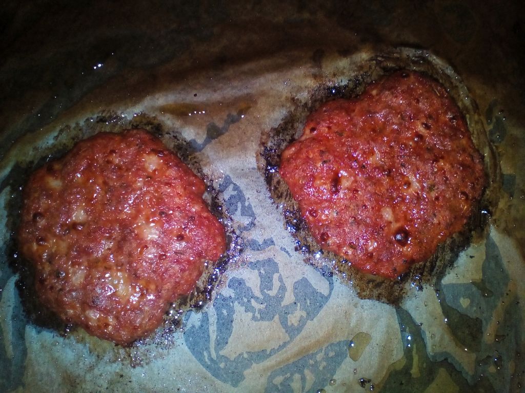 To πιλάφι σου είναι δια το peos διότι από ότι βλέπω είναι κοντό, κάνει για σούπες.Έριξα δύο μπιφτέκια στο ταψί με λαδόκολλα και μετά στον φούρνο.