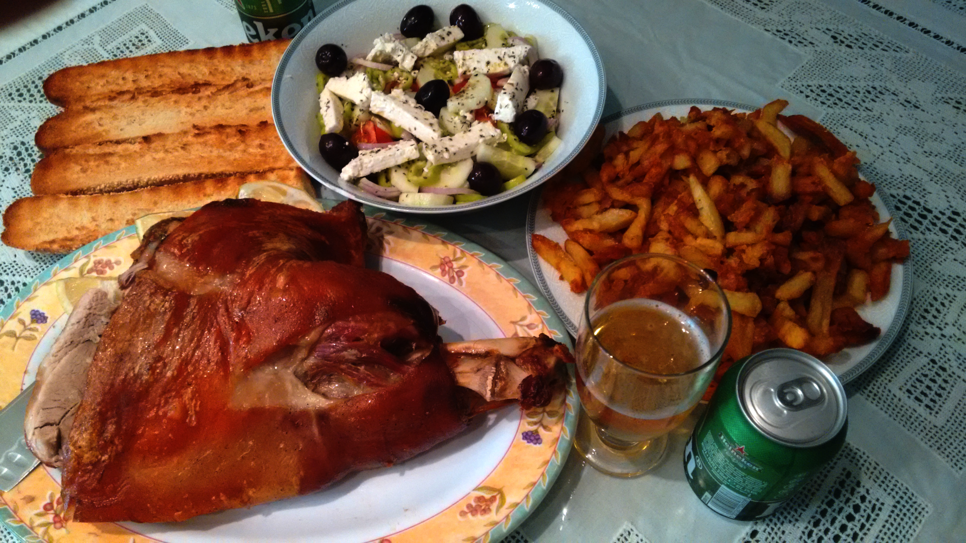 Πρίν λίγο σε φιλικό σπίτι φάγαμε ανάμεικτη μερίδα γύρο χοιρινό κ κοτόπουλο, καλαμάκια χοιρινά (sorry μιχάλη!:)), λουκάνικο χωριάτικο, τυρί σαγανάκι, κολοκυθοκεφτέδες, κολοκυθάκια τηγανητά, σαλάτα caesar, τζατζίκι, πατάτες τηγανιτές κλπ..