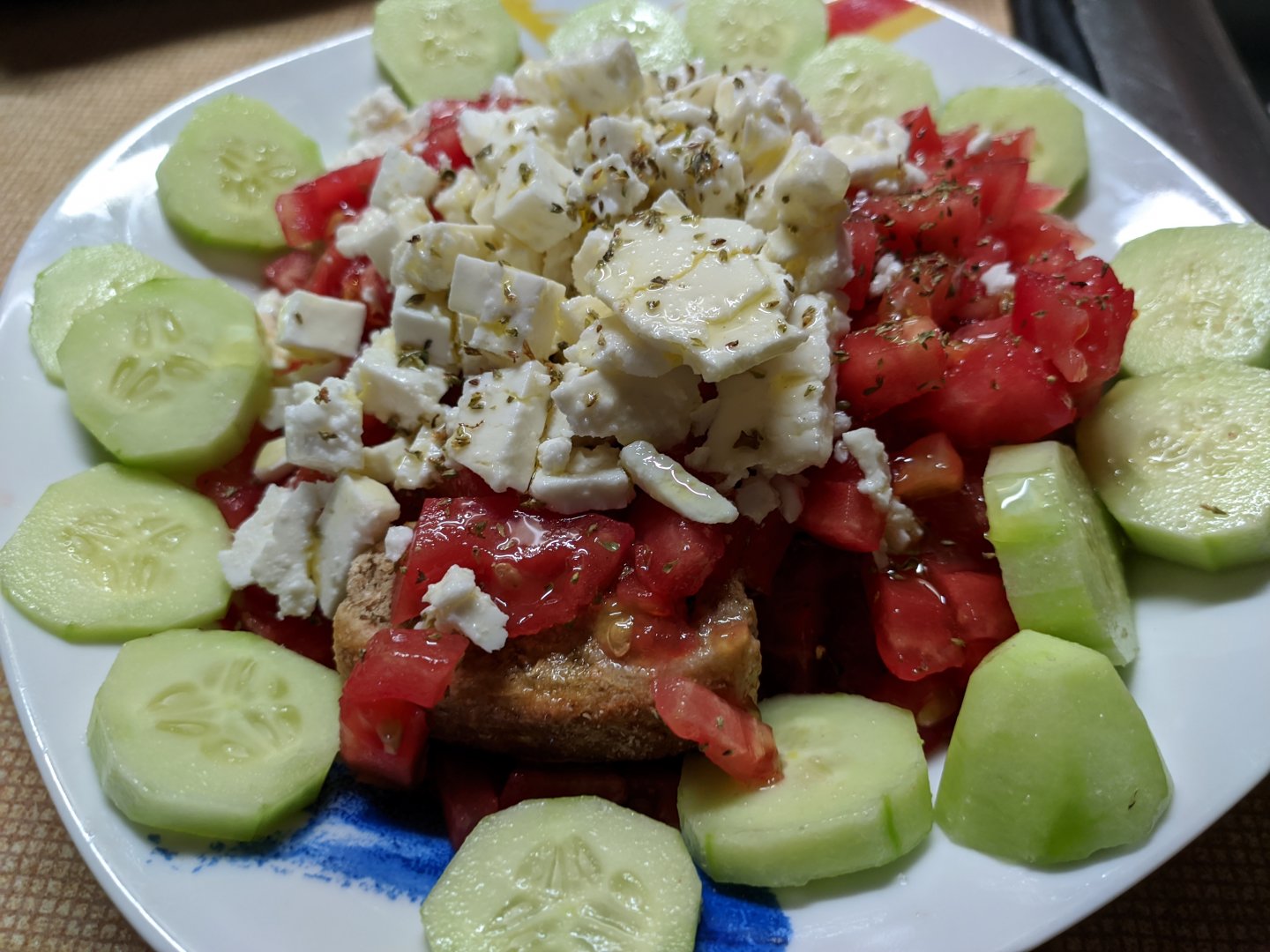 Σε λέω τα έχω φάει όλα, το σ/κ έγινε επιδρομή σε αποθήκη και κουζίνα, από σήμερα το πρωί έκοψα λίγο το φαΐ... Όταν λέμε έκοψα, έφαγα ένα πιάτο τραχανά για πρωινό με 2 βραστά αυγά και μπόλικο ψωμί, τώρα που γράφω στο άλλο χέρι κρατάω ένα σαντουίστ τυρί γαλοπούλα και στο ψυγείο έχω 2 μαύρα τοστ να περιμένουν...Ο ντάκος συνήθως δεν περιλαμβάνει αγγούρι. Ελιές όμως και ενίοτε και κάπαρη παίζουν.