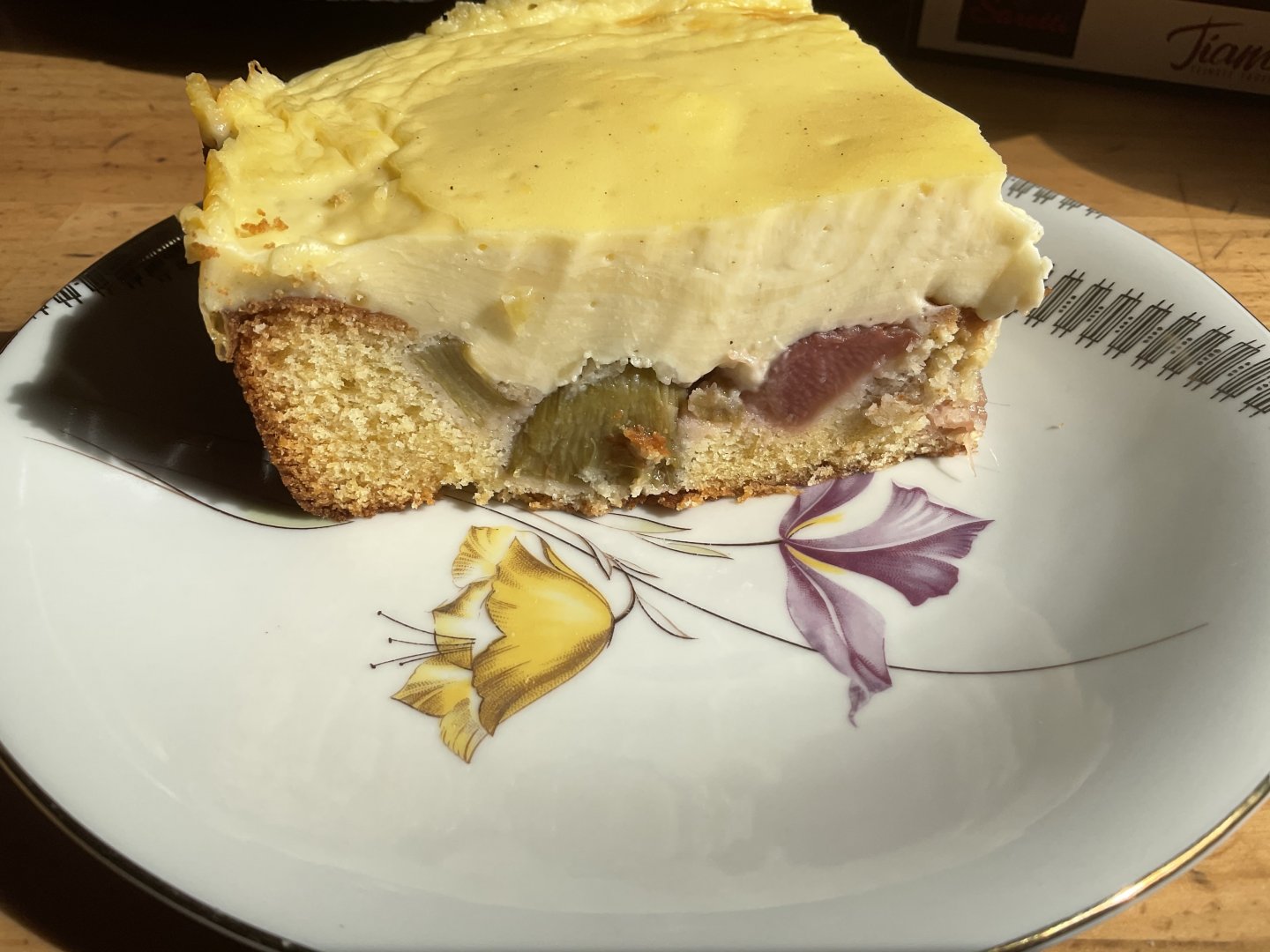 Ραμπαρμπερ (η αλλιώς ρούμπαρμπ,η ράβεντι στα ελληνικά )βυθισμένα σε ζύμη κέικ,με πουτίγκα βανίλιας διανθισμένη με κρεμ φρες: