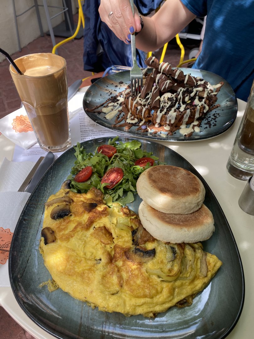 και ομελετα τεραστια με 3 αυγα, σαλαμια κασερια ,σοροπια μαρουλια μανιταρια πιπιεριες και δεξερωγωτι