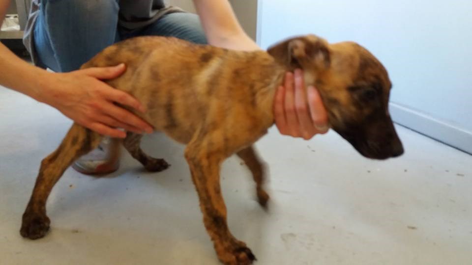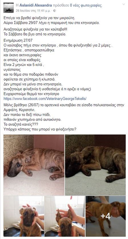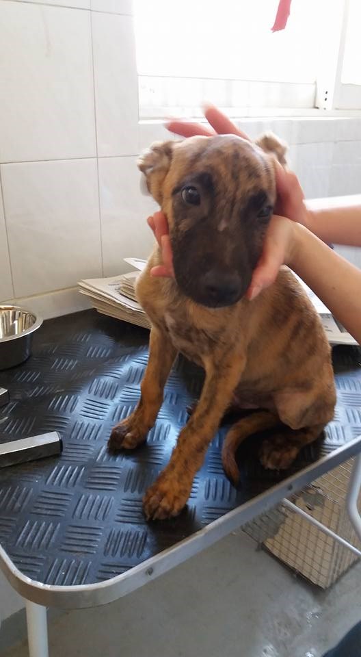 Το σκυλάκι είναι 2 μηνών και ζυγίζει 5 κιλά. Εξετάστηκε από κτηνίατρο, αποπαρασιτώθηκε και έκανε ακτινογραφίες, οι οποίες είναι καθαρές. Η παραμονή του όμως στο κτηνιατρείο λήγει το Σάββατο 29/07.