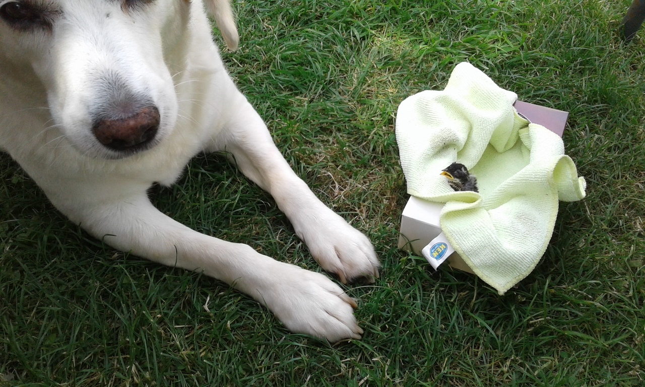 ο μικρουλης ζει στην Αγγλια και ειναι ενα ειδος χελιδονιου (ονομαζετε house martin το ειδος αυτο) , πριν 2 εβδομαδες επεσε απο την φωλια του, το συγγενικο σπιτη που τον βρηκαν τον εβαλαν σε μια προχειρη "φωλια" και απο τοτε κανει παρεα με το θυληκο Labrador που εχουν.