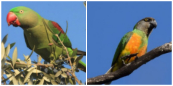 Αριστερά: Ευπατρίδης Ψιττακίσκος είναι καταπράσινος με κόκκινο ράμφος και μια κόκκινη στάμπα σε κάθε φτερούγα Δεξιά: Φαιοκέφαλος Σενεγάλης. Πηγή φωτογραφιών: Ελληνική Ορνιθολογική Εταιρεία...