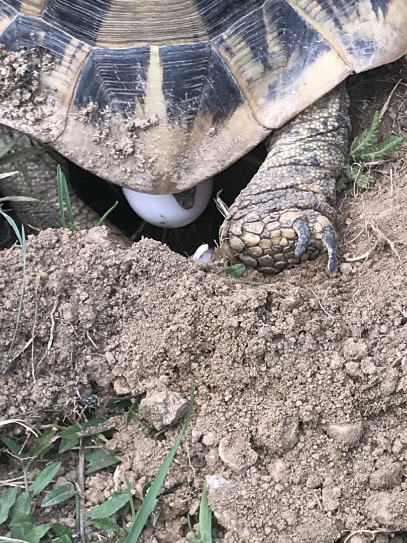 Μία από τις δυο μεγάλες χελώνες στον κήπο μου (φιλενάδες :laugh:) γέννησαν ταυτόχρονα από 8 αυγά σε απόσταση 5μ η μια από την άλλη.