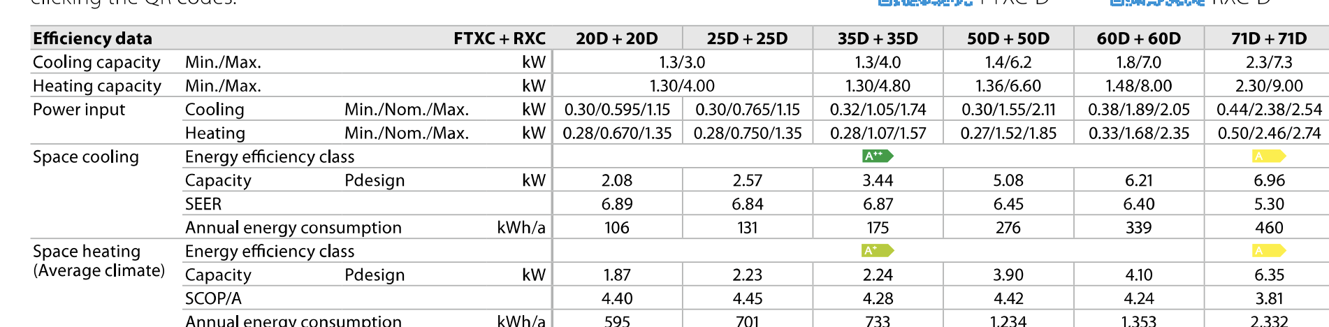 Όλα Daikin, αλλά το μεγαλύτερο sensira έχει SCOP/A 3,81 ενώ το μικρότερο ururu 5,9!