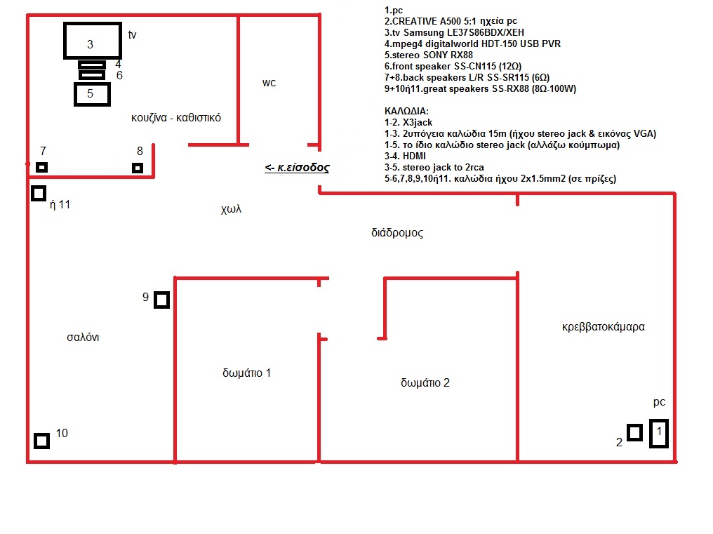 (όπου συσκευή 6 .... τα 2 κυρία ηχεία που αναγράφονται ως great speakers στις θέσεις 9,10,11. όπου 9,10,11 .... οι πρίζες που υπάρχουν ως αναμονή για την τοποθέτηση 2 ηχείων)