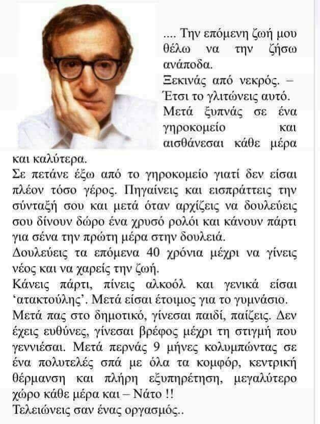 Γούντι Άλεν:«Την επόμενη ζωή μου θέλω να την ζήσω ανάποδα. Ξεκινάς από νεκρός.Έτσι το γλιτώνεις αυτό. Τελειώνεις σαν οργασμός»