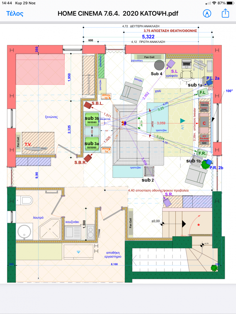 Έχει μια γωνία θέασης σε πρασινάκι για τα ηχεία και μια γωνία από τον προβολέα σε κοκκινάκι, που ομολογουμένως δεν χρειάζεται.Με την γωνία θέασης τι παίζει; Γιατί την μέτρατε από τον προβολέα στα μπροστά ηχεία και όχι από την θέση σας στην οθόνη προβολής;