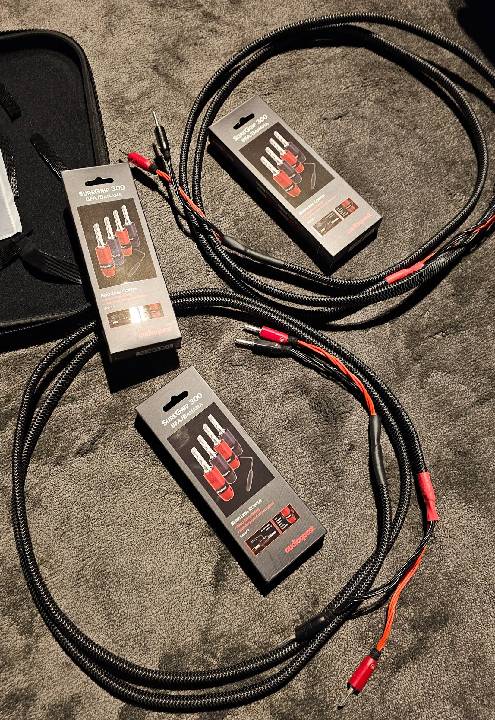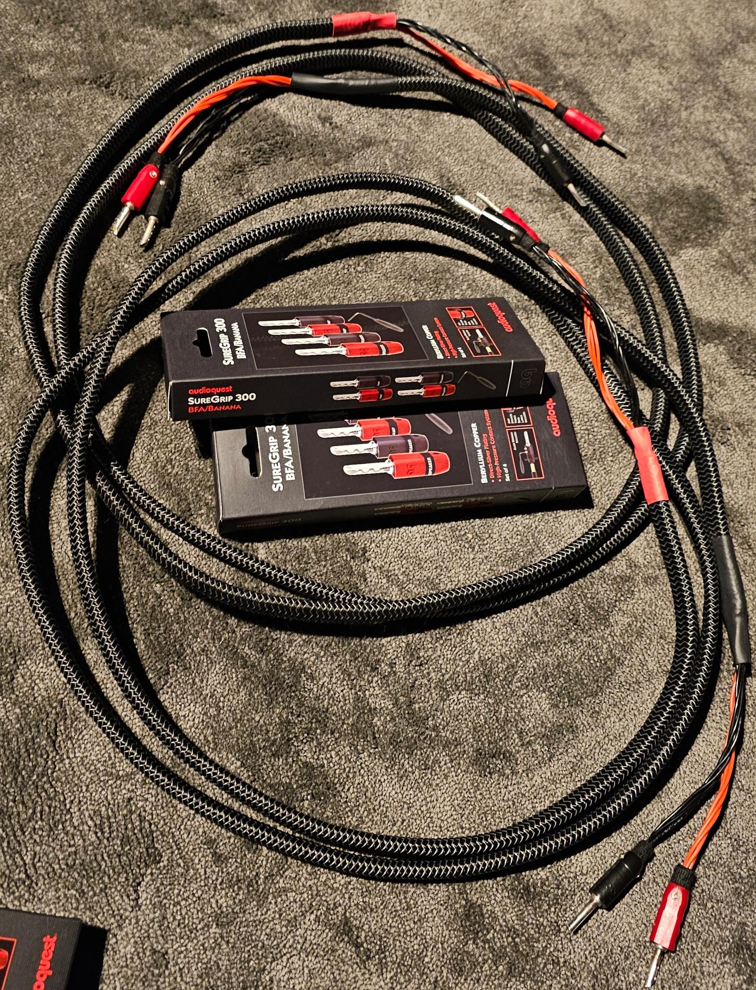 Πωλούνται τα καταπληκτικά καλώδια ηχείων Audioquest Rocket 44, full range 2x3m μήκος. Είναι τερματισμένα με μπανάνες Audioquest Suregrip 300 και από τις δύο μεριές, ενισχυτή και ηχείων. Αγορασμένα από ελληνικό κατάστημα, είναι σε κατάσταση κυριολεκτικά καινούργιου χωρίς το παραμικρό.