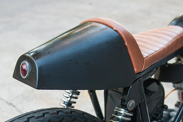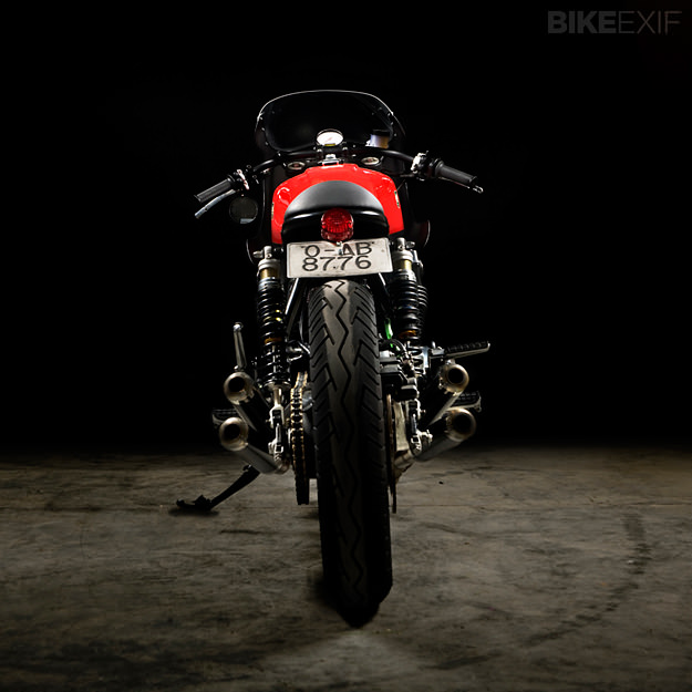 Γενικως τα πραγματα που εχουν προστεθει στην μοτοσυκλετα ειναι ελαχιστα, περισσοτερα ειναι αυτα που εχουν αφαιρεθει. Για εναν περιεργο λογο καποιες μοτοσυκλετες εαν αφαιρεσεις συγκεκριμενα πραγματα απο πανω τους, αφηνουν να κυριαρχησουν καποιες λεπτομεριες που σε αλλη περιπτωση με τον φορτο των τριγυρω εξαρτηματων πνιγονται και δεν τις παρατηρει το ματι. Τα μονα πραγματα που προστεθηκαν ειναι το φαναρι, το τιμονι, η σελα και τα ελαστικα, τα πισω φλασακια, η πινακιδα στα αριστερα μαζι με το στοπ της. Ισως να φαινεται περιεργο, αλλα οι ζαντες ειναι οι δικες της. Οι εξατμησεις ειναι aftermarket αλλα τις ειχε οταν την αγορασα. Το τελικο κοστος ανηλθε περιπου στα 2500ε συμπεριλαμβανομενης της αγορας της μοτοσυκλετας, αλλα με πολυ προσωπικη εργασια, καποιες γνωριμιες σε λαμαριναδικα-μηχανουργεια και χωρις βιασυνη για το αποτελεσμα. Να ειστε καλα :drinks: