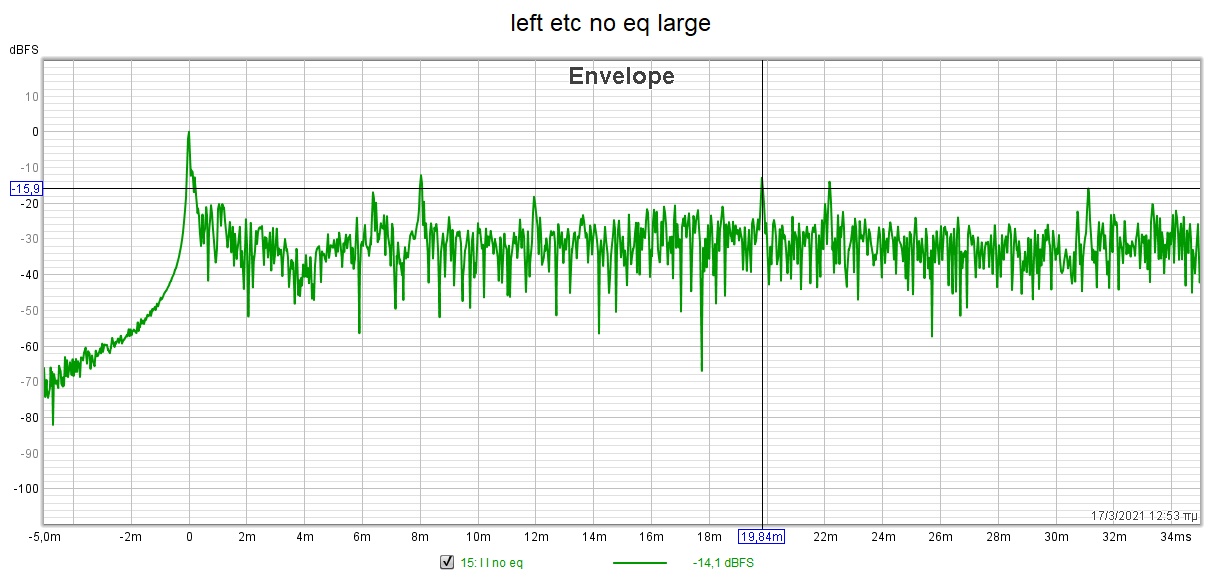Θα σου δώσω παράδειγμα πώς να μελετήσεις τα ETC...Στο κεντρικό κανάλι μόνο του εμφανίζεται πληθώρα έκτοπων συνιστωσών με σημαντική ενέργεια (ανώτερη του -20 dB ) εντός των πρώτων δύο msec.Ανάλογες υπάρχουν όταν εκπέμπουν μαζί L-C &R-C αλλά 'οχι στο L-R...Αυτό σημαίνει ξεκάθαρα ότι οφείλονται σε πολύ κοντινές επιφάνειες ως προς το κεντρικό,αφού υπάρχει ελάχιστη χρονική διαφορά προς τον άμεσο ήχο.