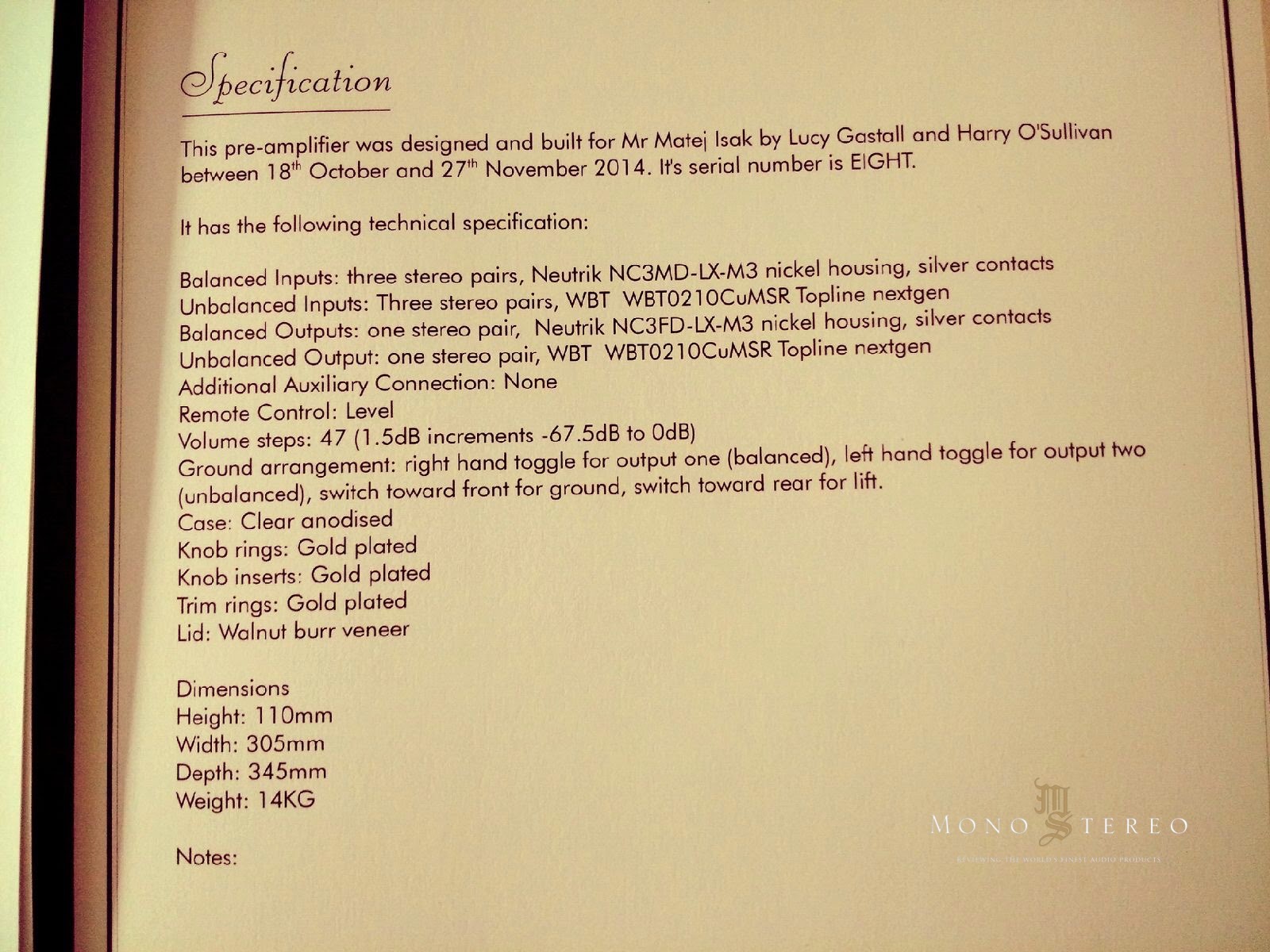 Ο ήχος ήταν από τους πλέον εντυπωσιακούς της εκθέσεως και ομοιογενής σε ευρύ πεδίο πέραν του νοητού στερεοφωνικού τριγώνου.Παρά την προσφυγή σε τυποποιημένα εκθεσιακά άπαντα για το πρόγραμμα αναπαραγωγής,αρκετά κομμάτια επιδείξεως ξέφευγαν από τη ζώνη άνεσης,θέτοντας σε πραγματική δοκιμασία τα ηχεία-ενισχυτές.