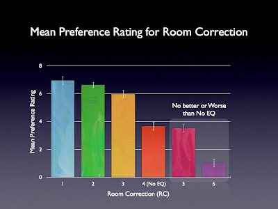 Three of the five room corrections (RC1-RC3) were strongly preferred over no room correction (RC4). However, one of the room corrections (RC5) was equally rated to the no correction treatment (RC4), and one of the room corrections (RC6) was rated much worse....