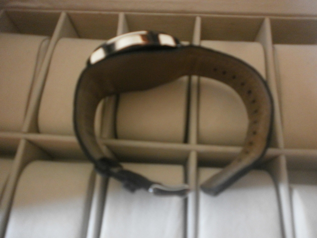 Με μεγαλο leather/ δερματίνη λουρακι (23.5 cm), παχυ και μεγαλο σε πλατος και με ωραιες λεπτομερειες (ραφες). Μοντερνος σχεδιο, με ασημι σωμα με ωραιες λεπτομερειες και ασημι/ γκρι (gunmetal) μεγαλο καντραν (47mm) με εντυπωσιακο σχεδιασμο και μαυρες/ ασημι λεπτομερειες.