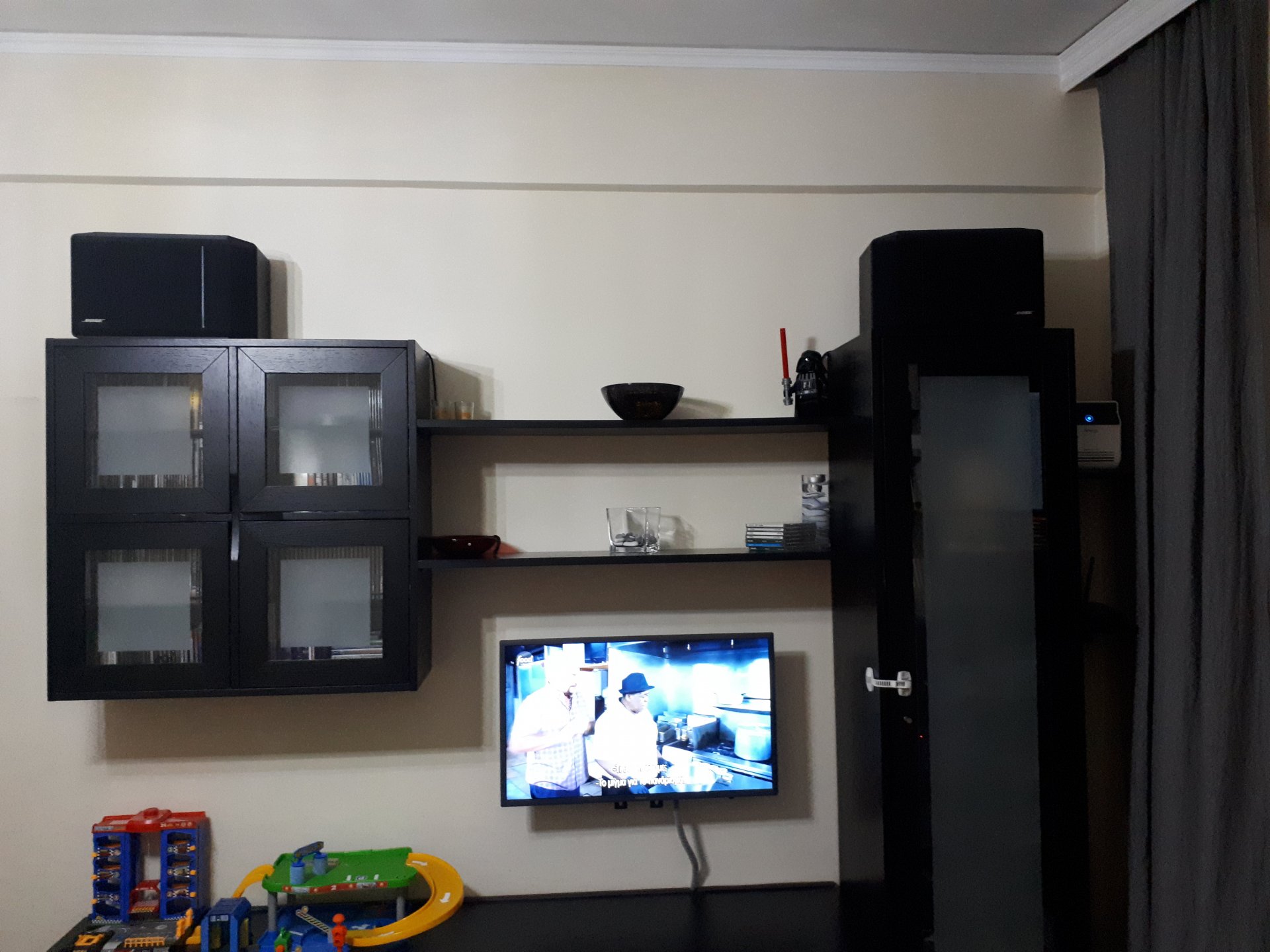 Από τη μία πλευρά του τοίχου είναι το σύνθετο με τα μηχανήματα τηλεόραση κτλ. και απέναντι είναι ο καναπές (απόσταση σύνθετου / καναπέ περίπου 2,5μ) όπου δεξιά και αριστερά κάτω στο πάτωμα είναι τα ηχεία τα οποία το μεν ένα είναι εγκλωβισμένο μεταξύ καναπέ και τοίχου και το άλλο μεταξύ καναπέ και βιβλιοθήκης.